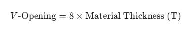 Example: If you are bending 2mm thick mild steel, you need a 16mm V-opening (2*8=16).